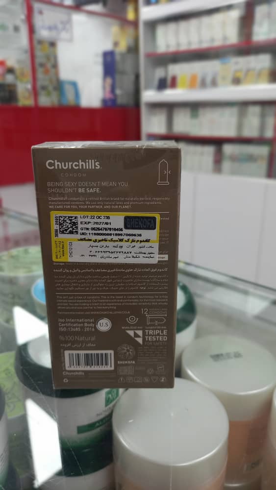 کاندوم 12عددی چرچیلز مدل Ultra Thin Lubricant 1945 دارای اسپرم کش با اسانس وانیل، مواد تأخیری و روان کننده بسیار نازک خاصیت ارتجاعی بسیار خوب با لاتکس 100 درصد طبیعی