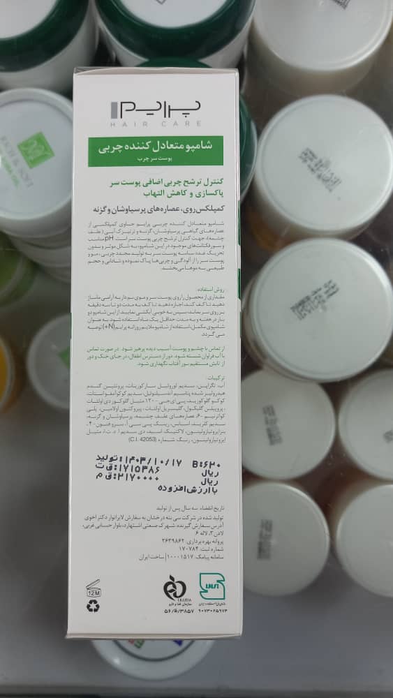 مناسب برایپوست سر چربحجم۲۵۰گرمکشور مبدا برندایرانسایر توضیحاتشامپو متعادل کننده چربی پریم +S مناسب پوست سر چرب کنترل ترشح چربی اضافه پوست سر پاکسازی و کاهش التهاب حاوی کمپلکس روی، عصاره های پر سیاوشان و گزنه
