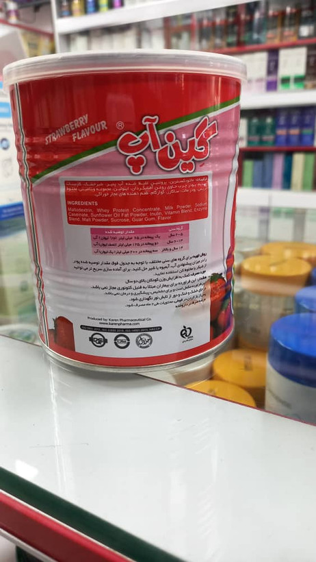 سایر توضیحات: پودرگین آپ ۳۰۰ گرمی باطعم توت فرنگی کمک به افزایش وزن کودکان بالای دو سال